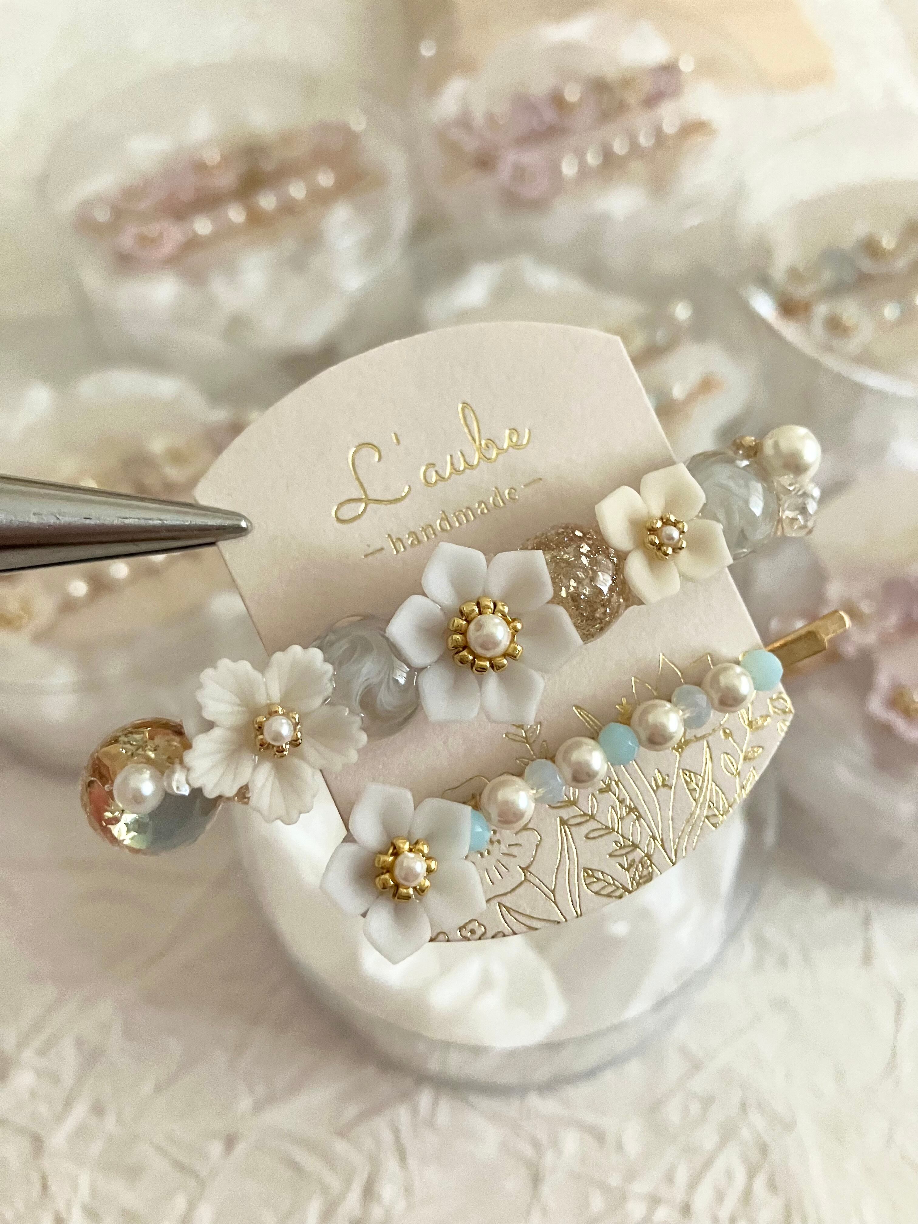 たくさんのお花やビーズが集まった宝石箱のようなヘアクリップ。
