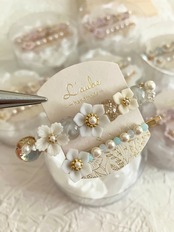 バランスを見ながら、ビーズやパールを付けているので全てが世界で一つの商品となります。