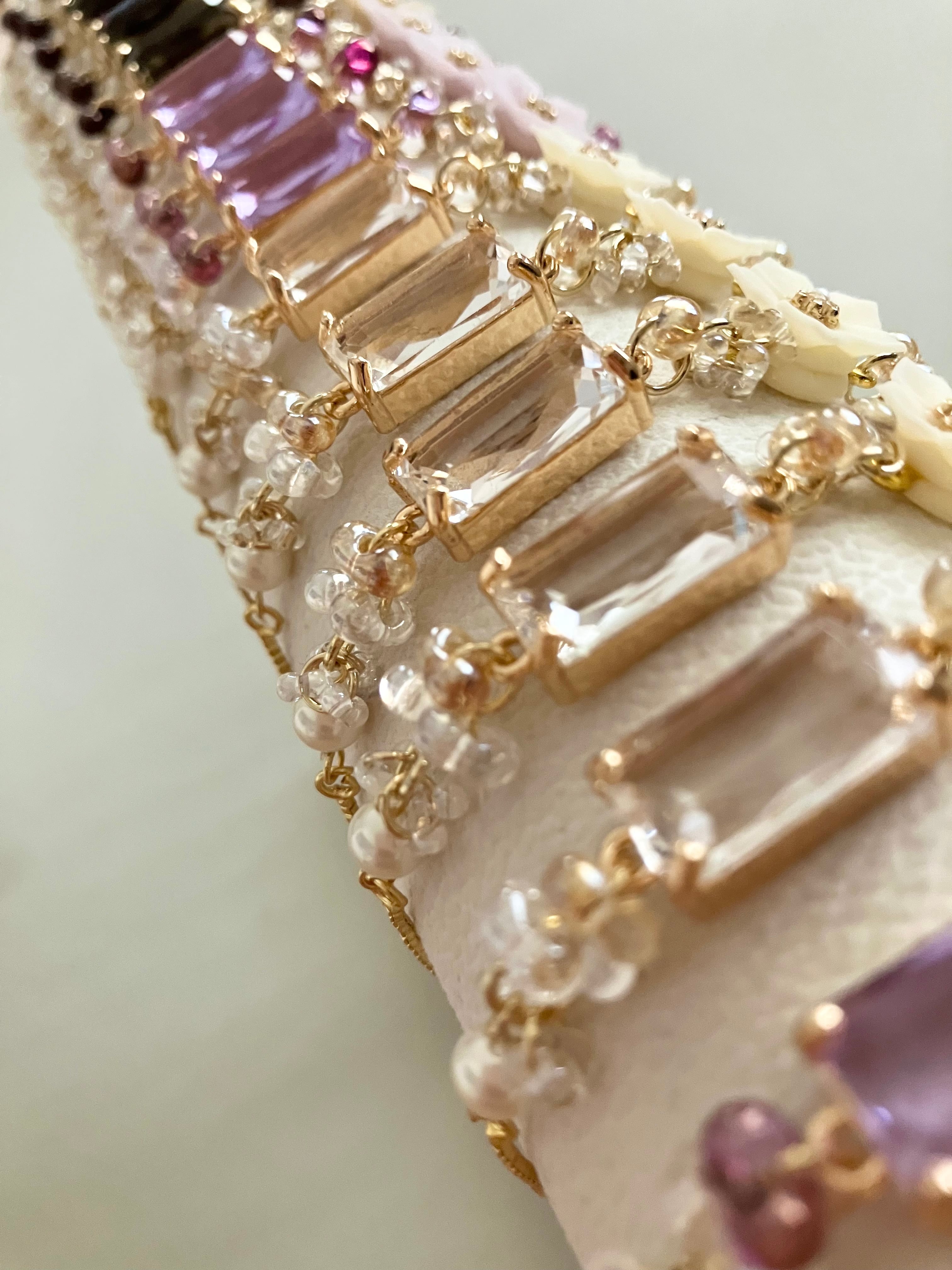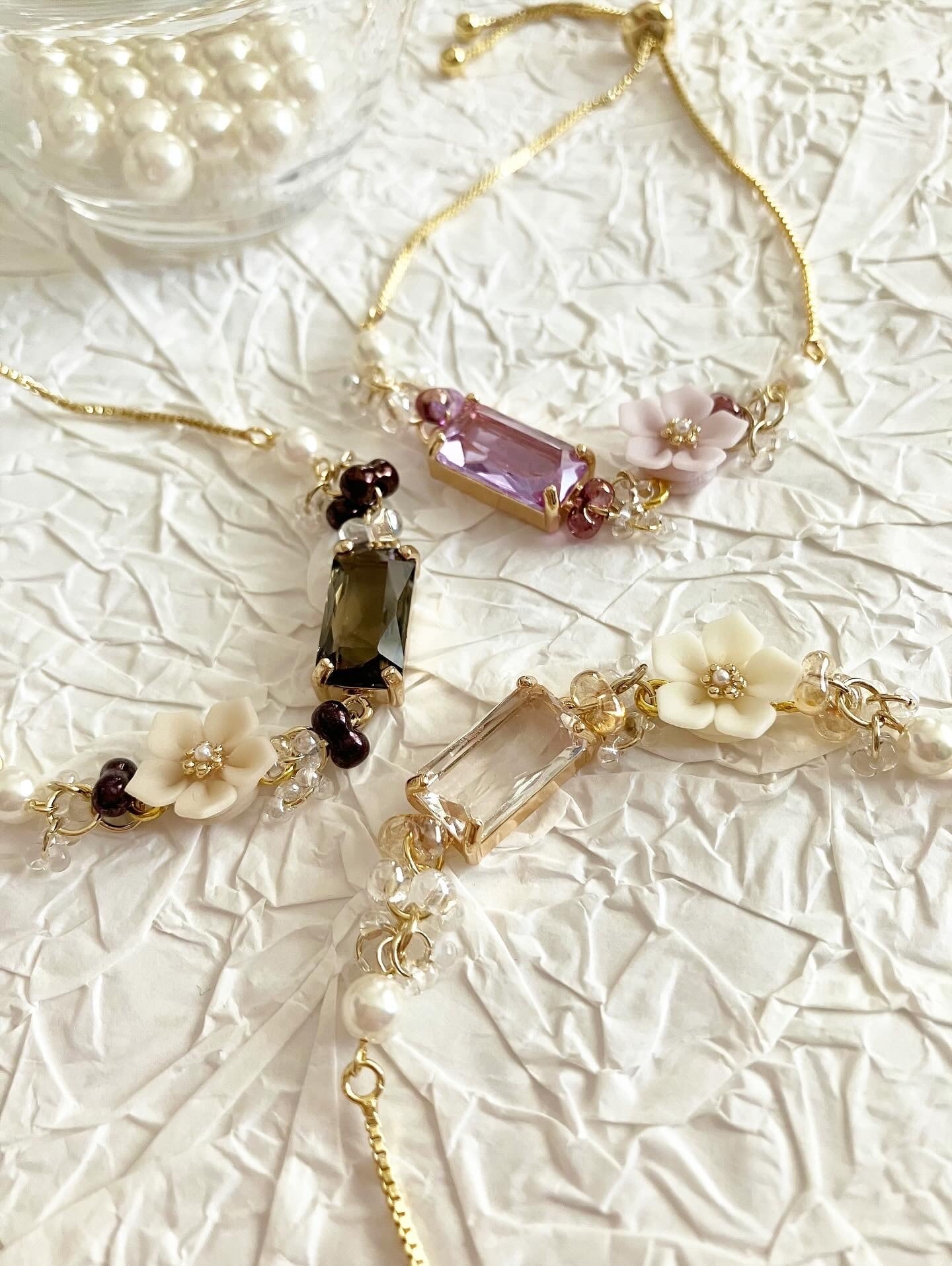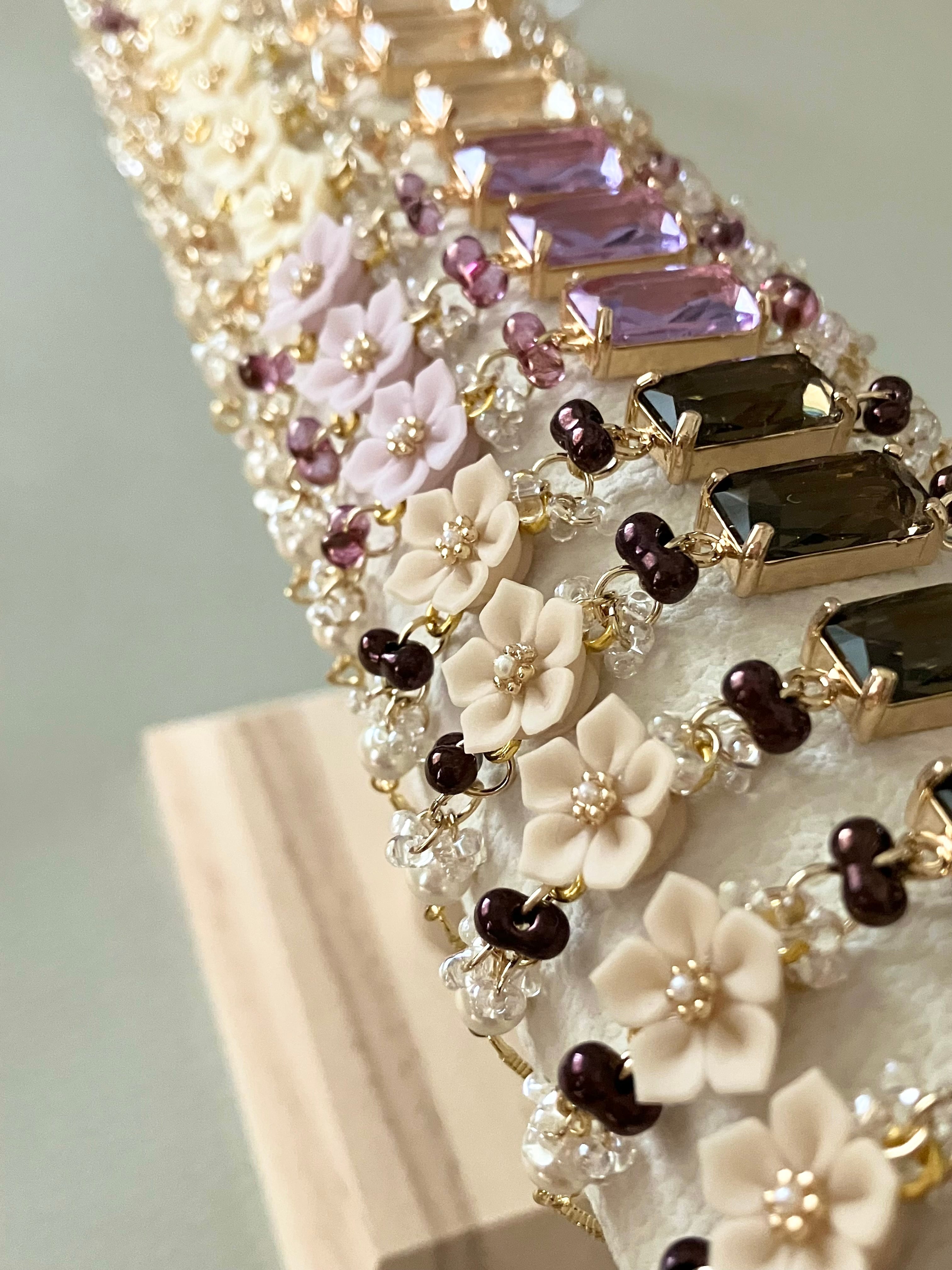 バランスを見ながら、ビーズやパールを付けているので全てが世界で一つの商品となります。